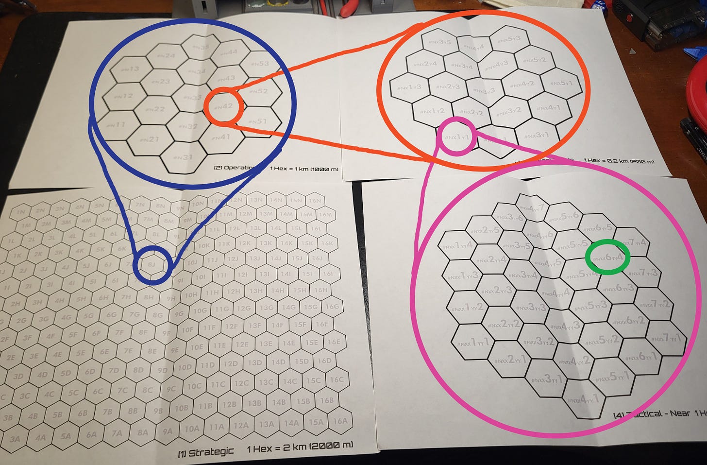 I am not even sure if I will need the fourth level of abstraction in all situations, but I feel like 3-4 is the maximum number of these hex grids on 8.5x11 sheets of paper for comfort in play, and you can see what I’m doing via this illustration below: